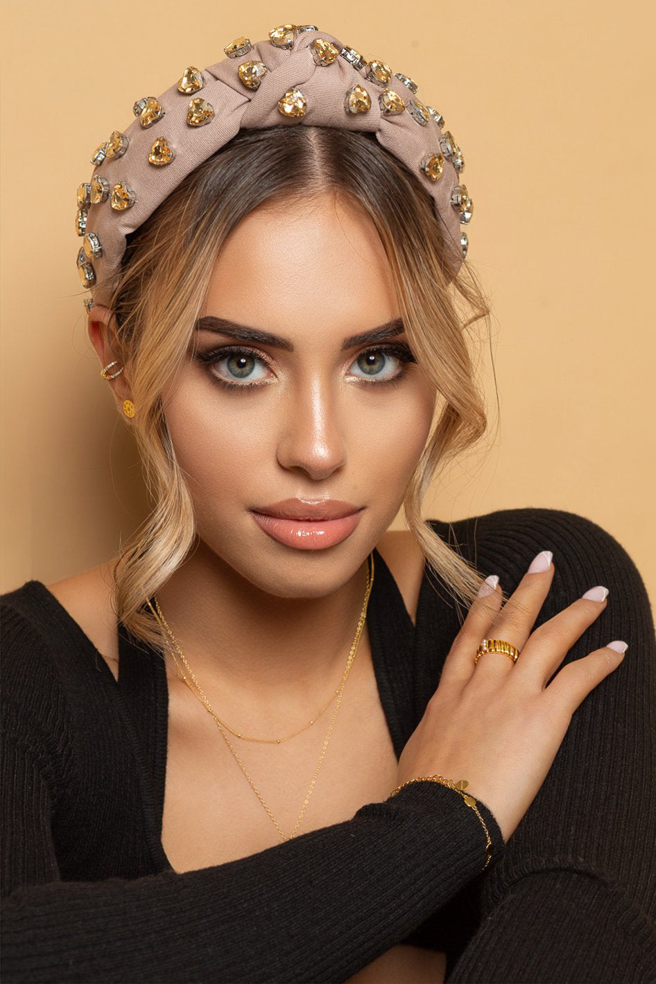 The unique headband Louise is a masterpiece that stands alone and gives every outfit that certain something. The champagne color goes perfectly with any skin tone and clothing style. The set crystals give every styling the WOW effect.