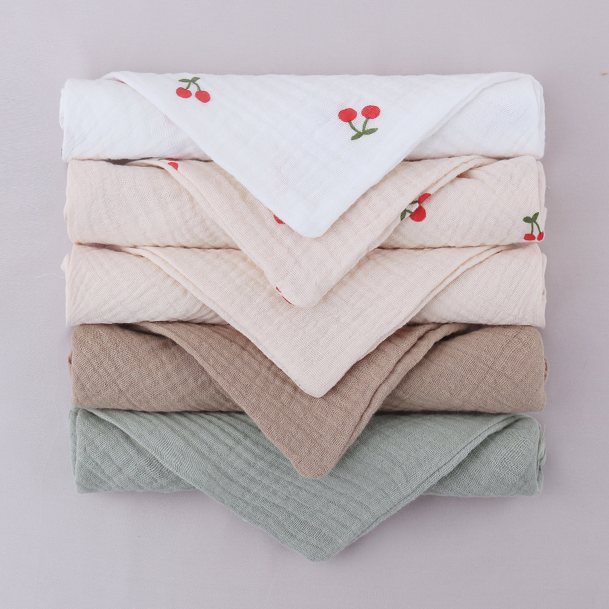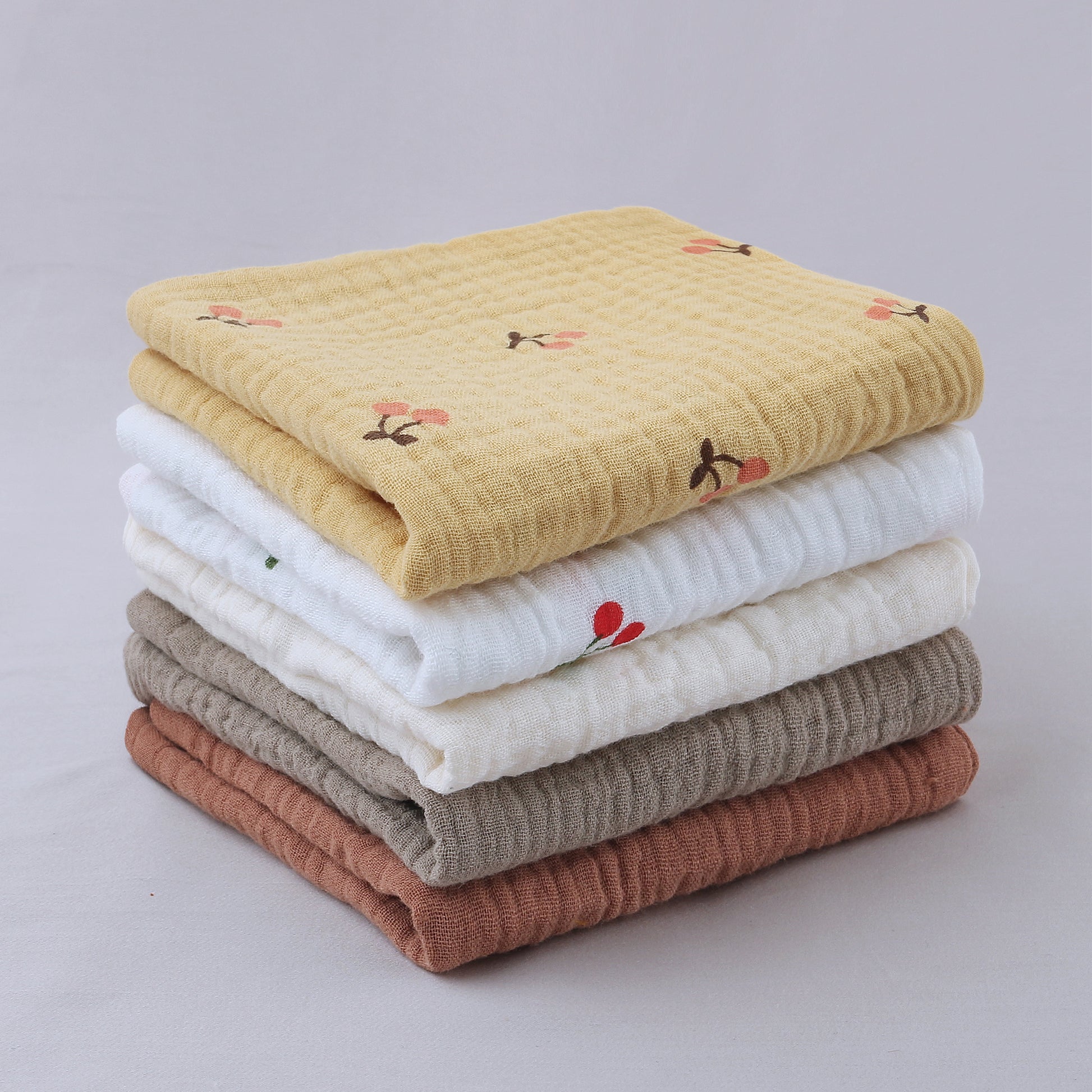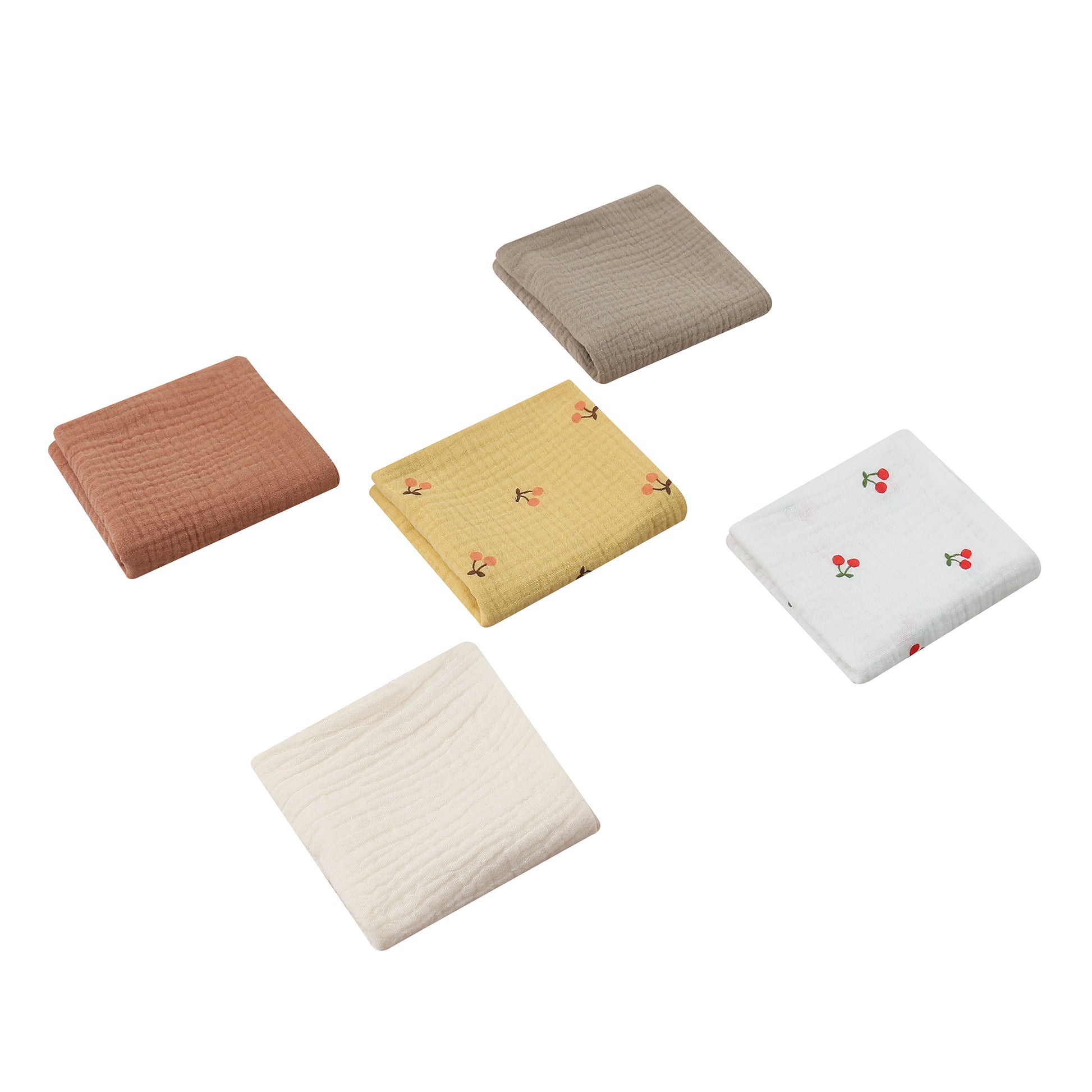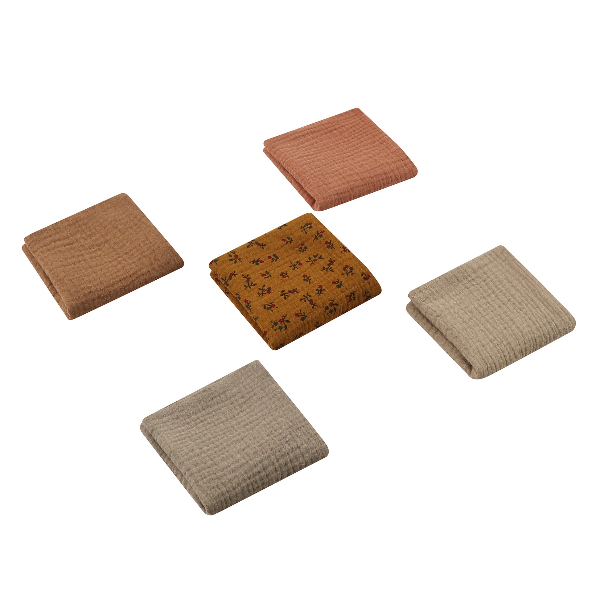 The set contains 5 towels that can always be used as a snuggle towel, mini blanket or when breastfeeding. You can also use them at the changing table, in the changing bag, or for minor accidents.