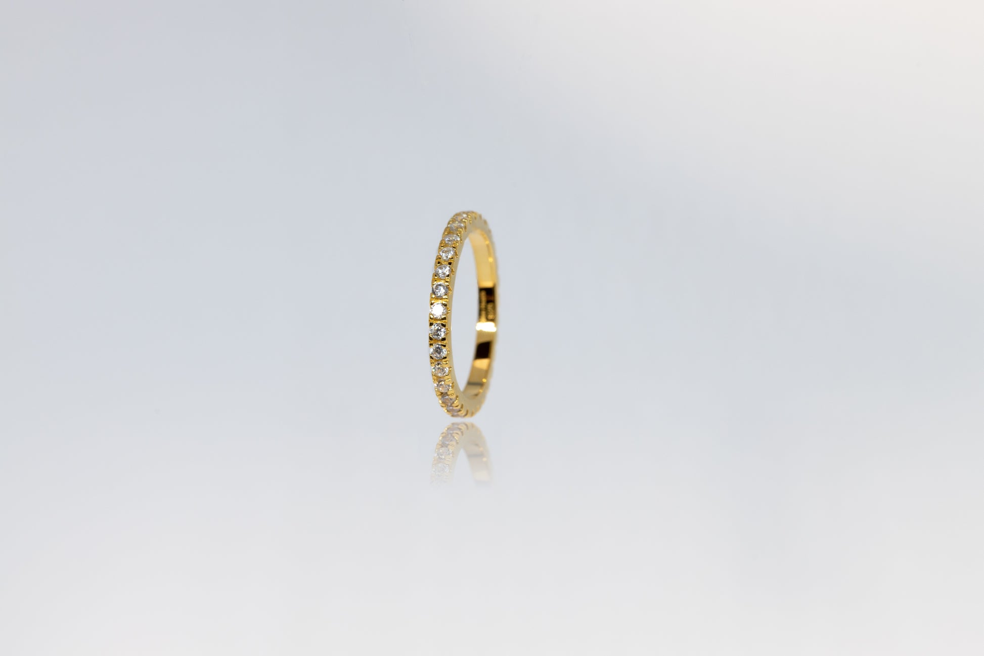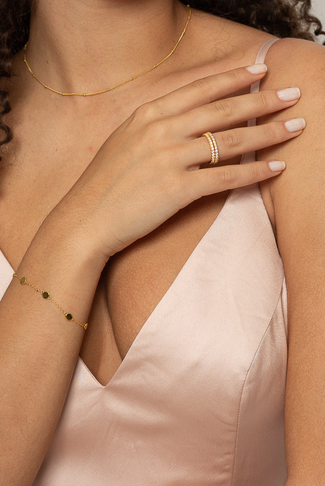 The Pari ring made of gold-plated 925 sterling silver is set with pure white zirconia stones and has the glittering look of an eternity ring. The piece of jewelery is filigree, sparkling and ideal for the stacked look.