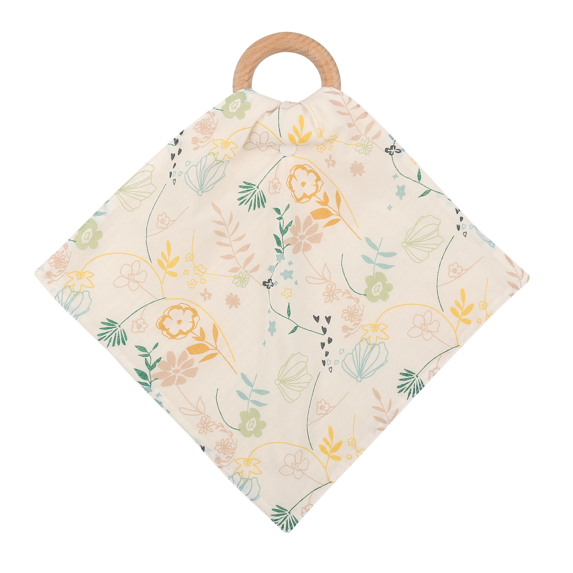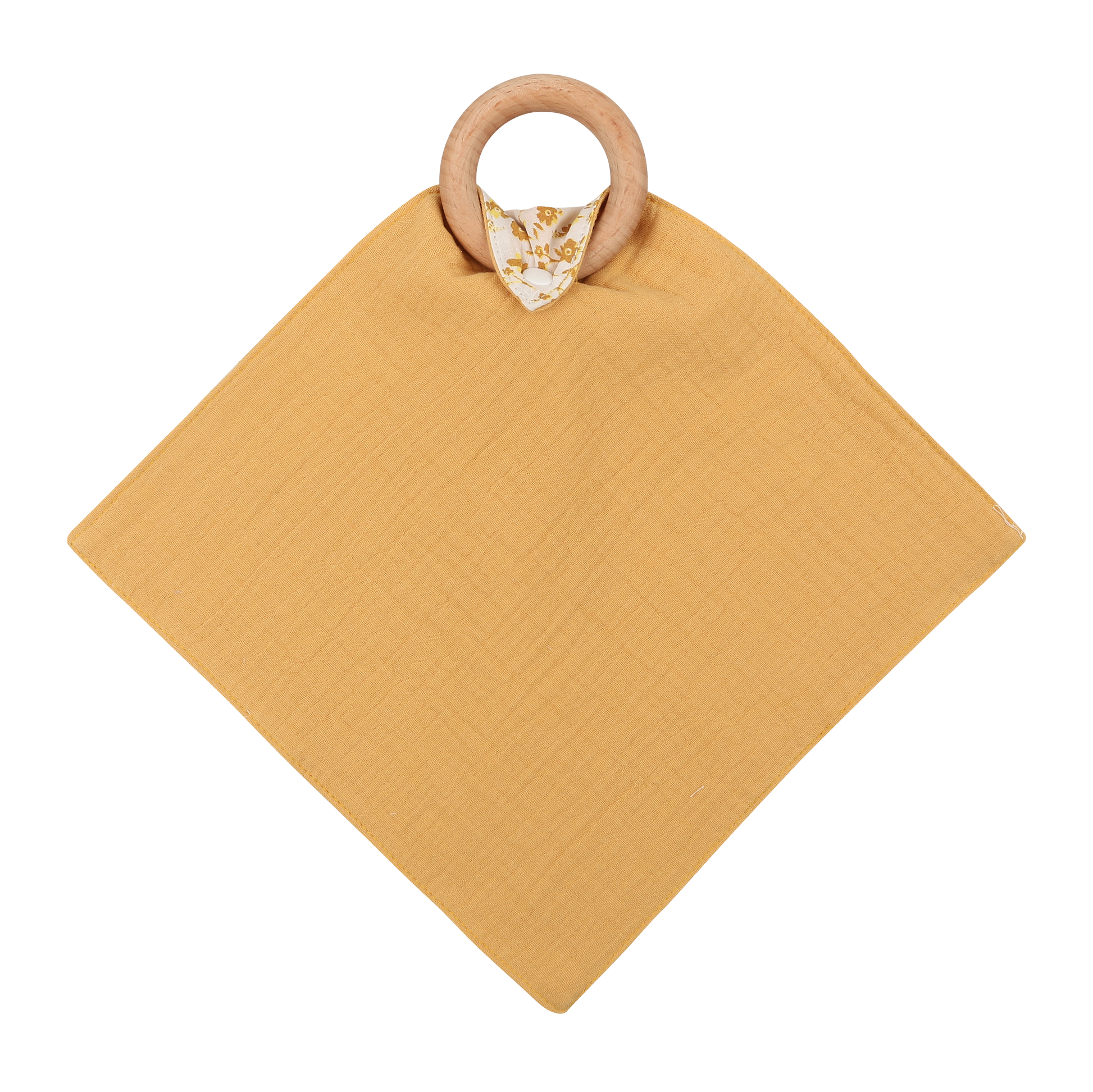 Der Beißring in Kreis-Optik wird mit einem daran angebundenen Musselin-Tuch geliefert.
