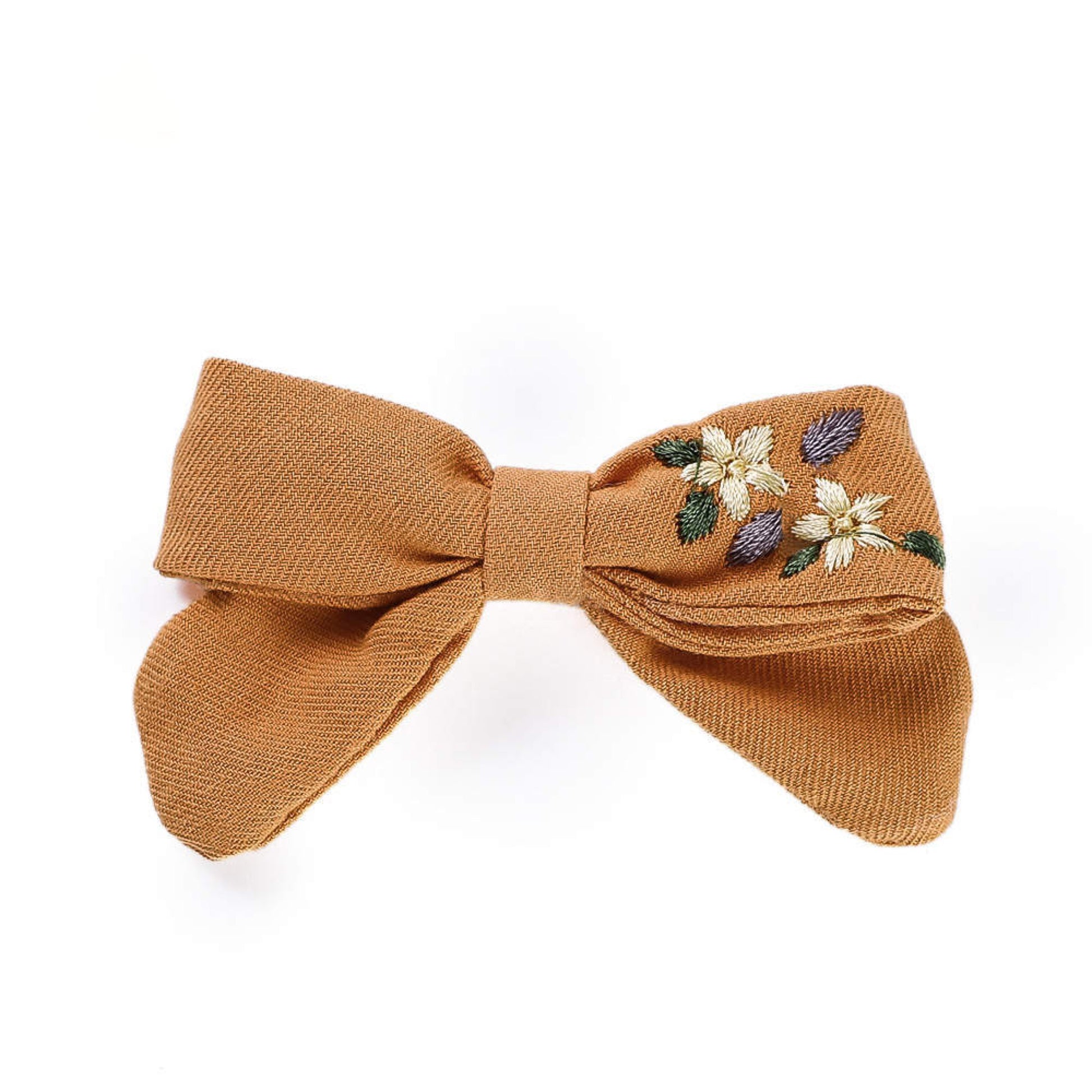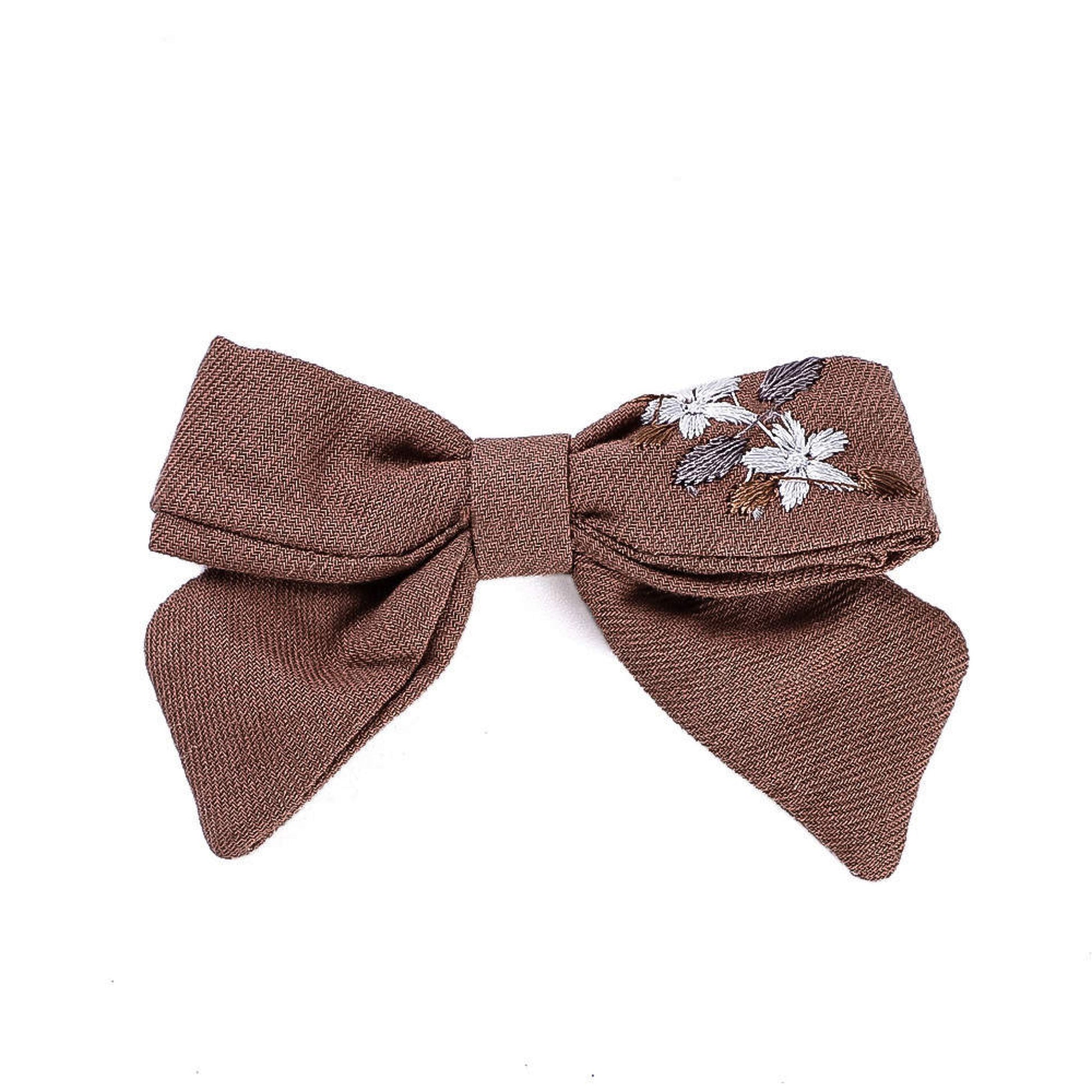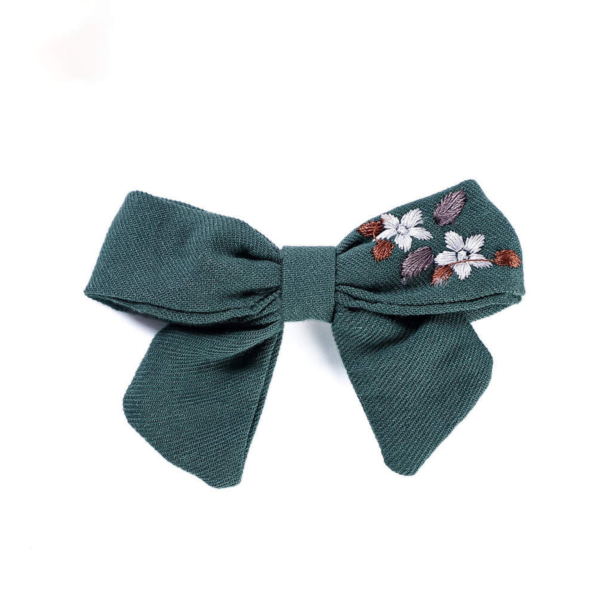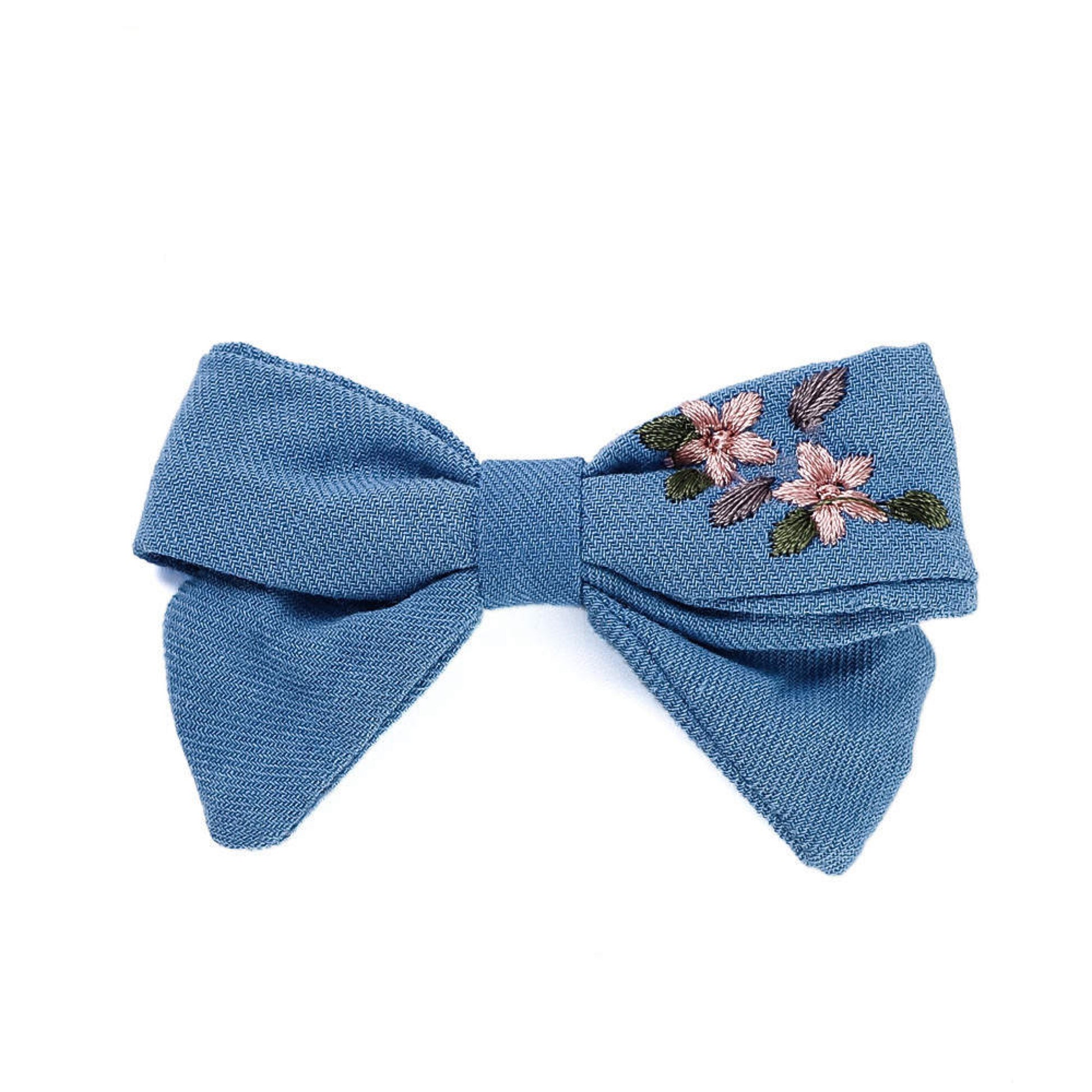 Unsere einzigartige handgemachte Haarschleife verkörpert den Charme von zauberhaften Blumenmotiven, die kunstvoll auf weicher Baumwolle gestickt sind.