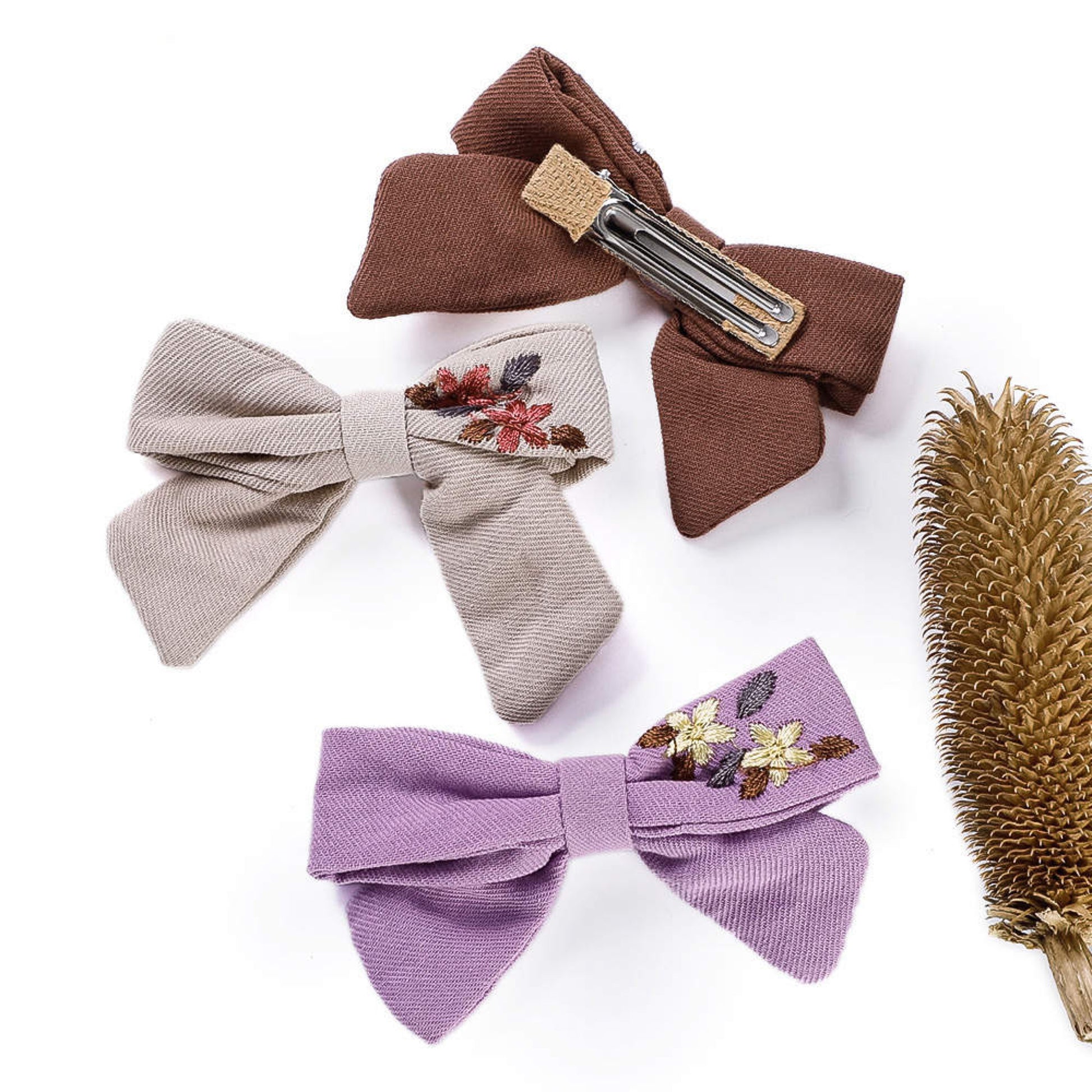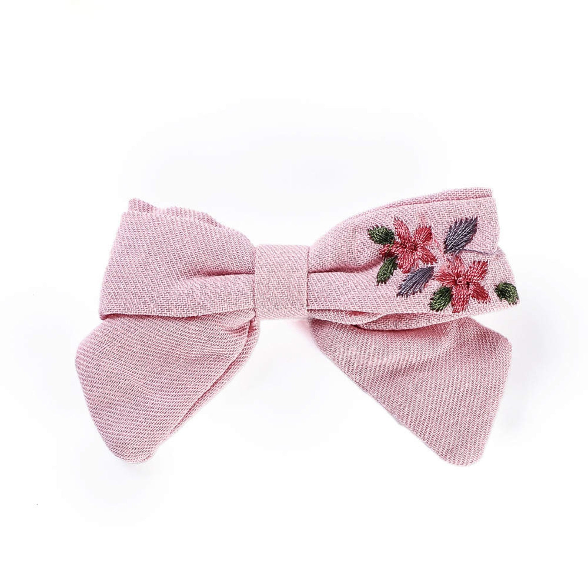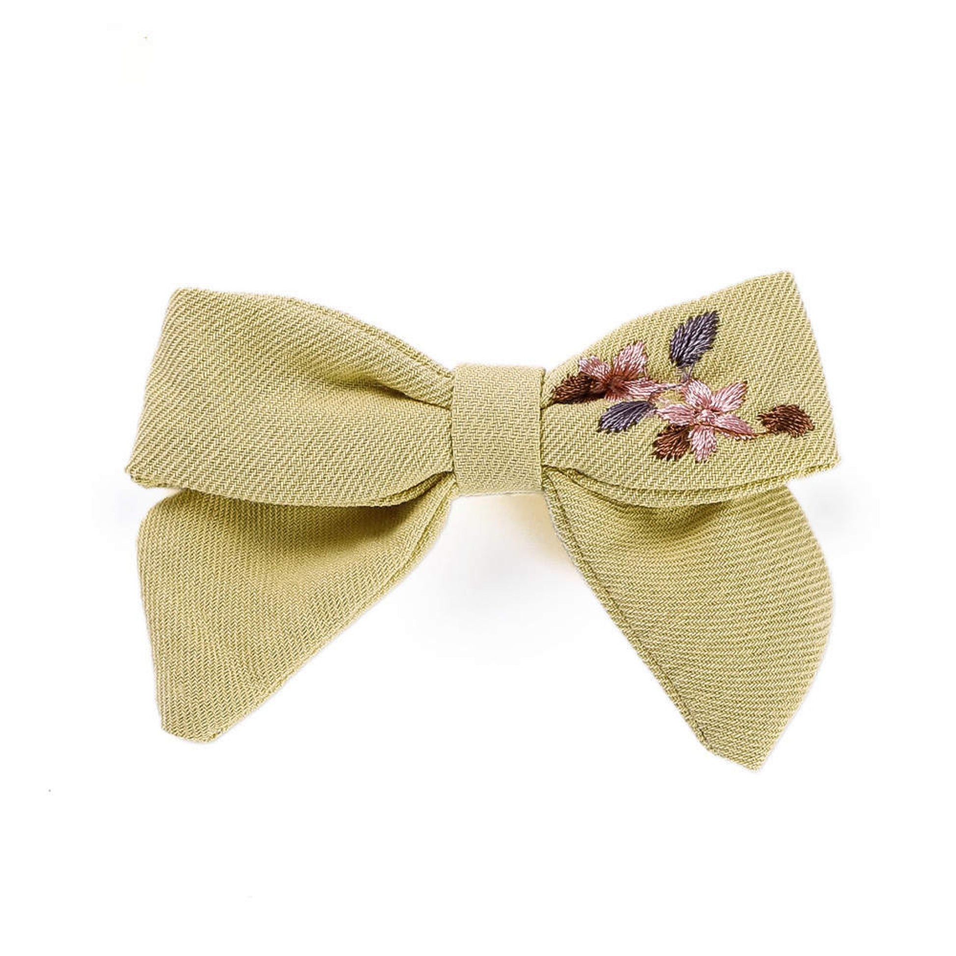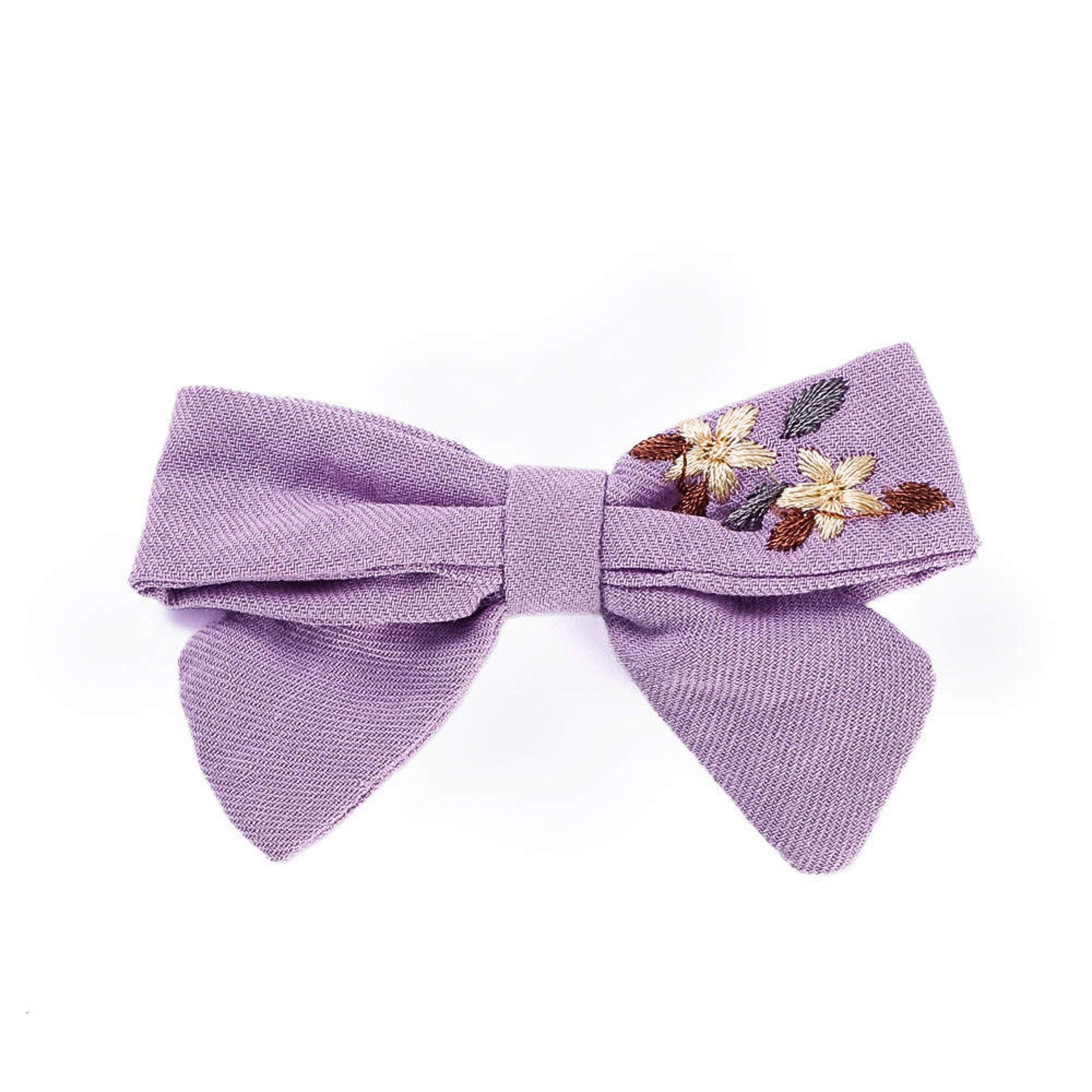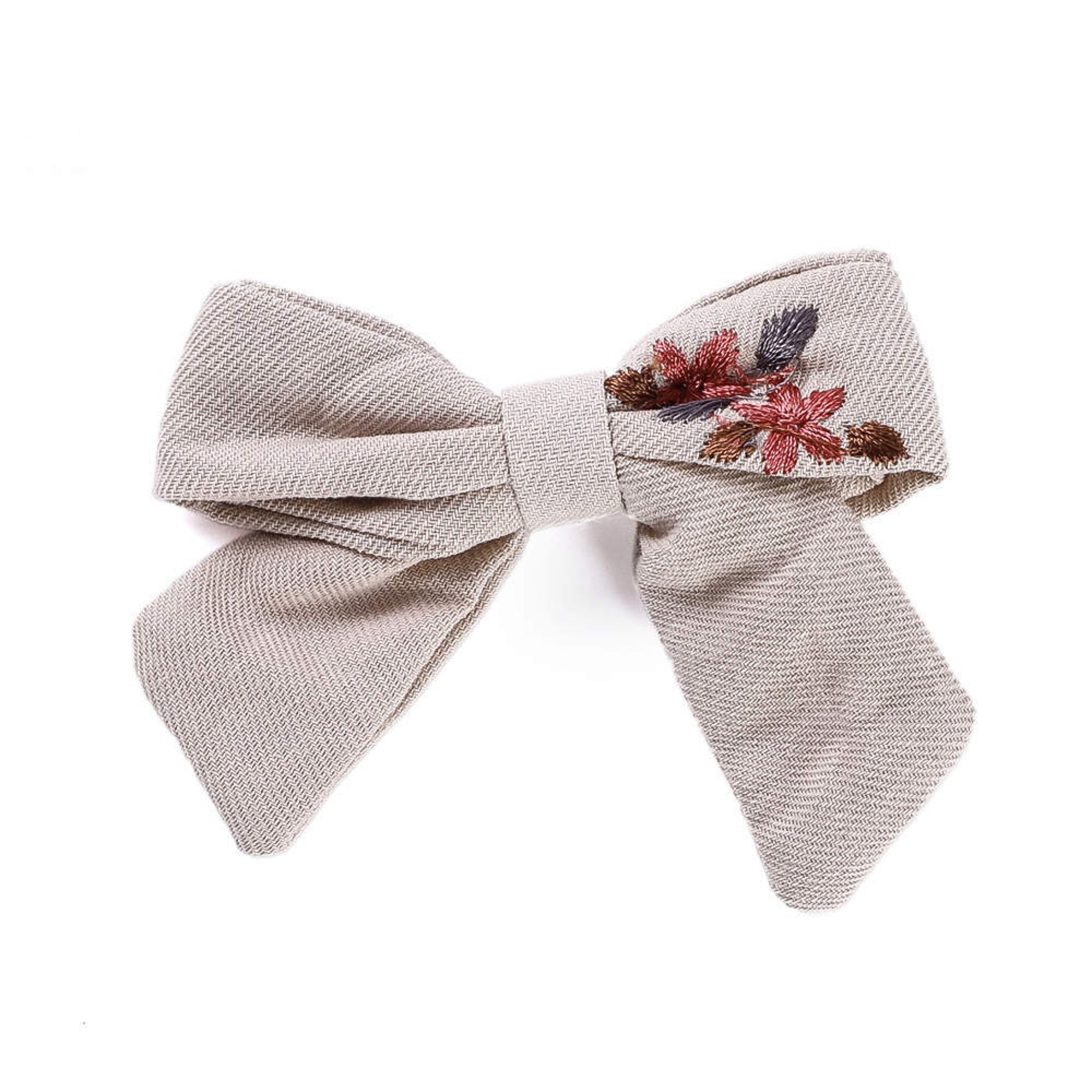 Unsere einzigartige handgemachte Haarschleife verkörpert den Charme von zauberhaften Blumenmotiven, die kunstvoll auf weicher Baumwolle gestickt sind.