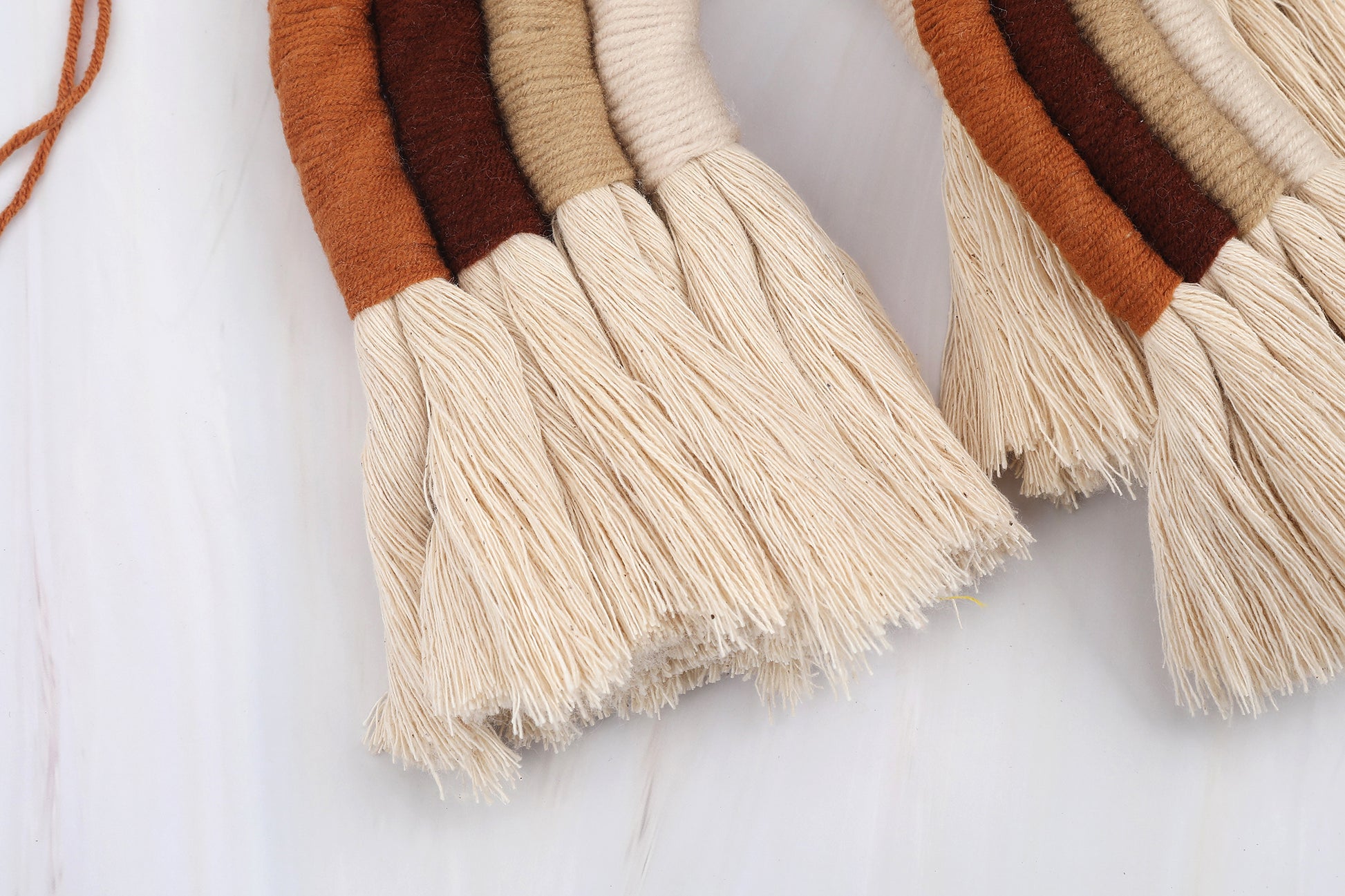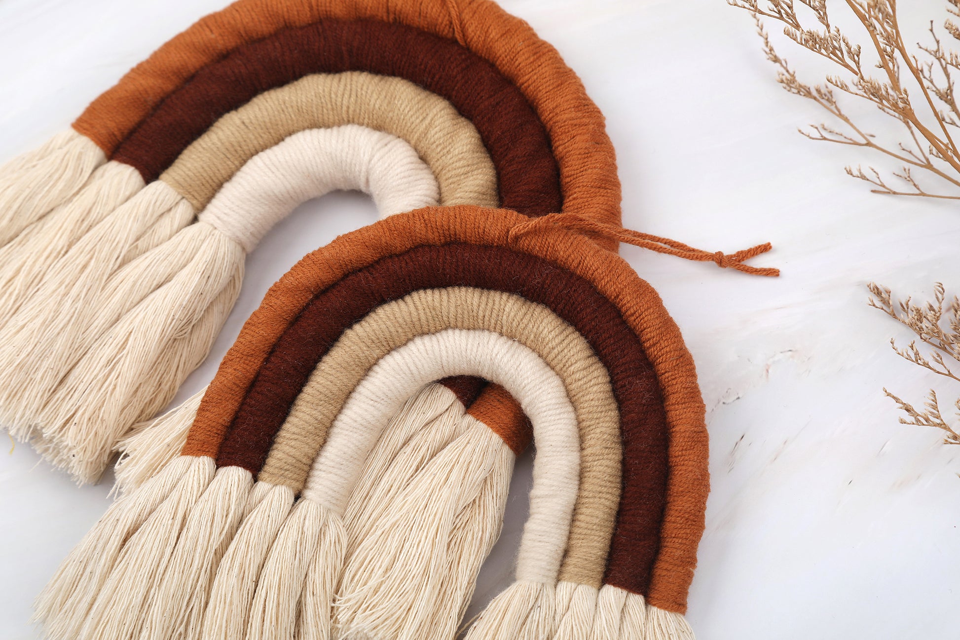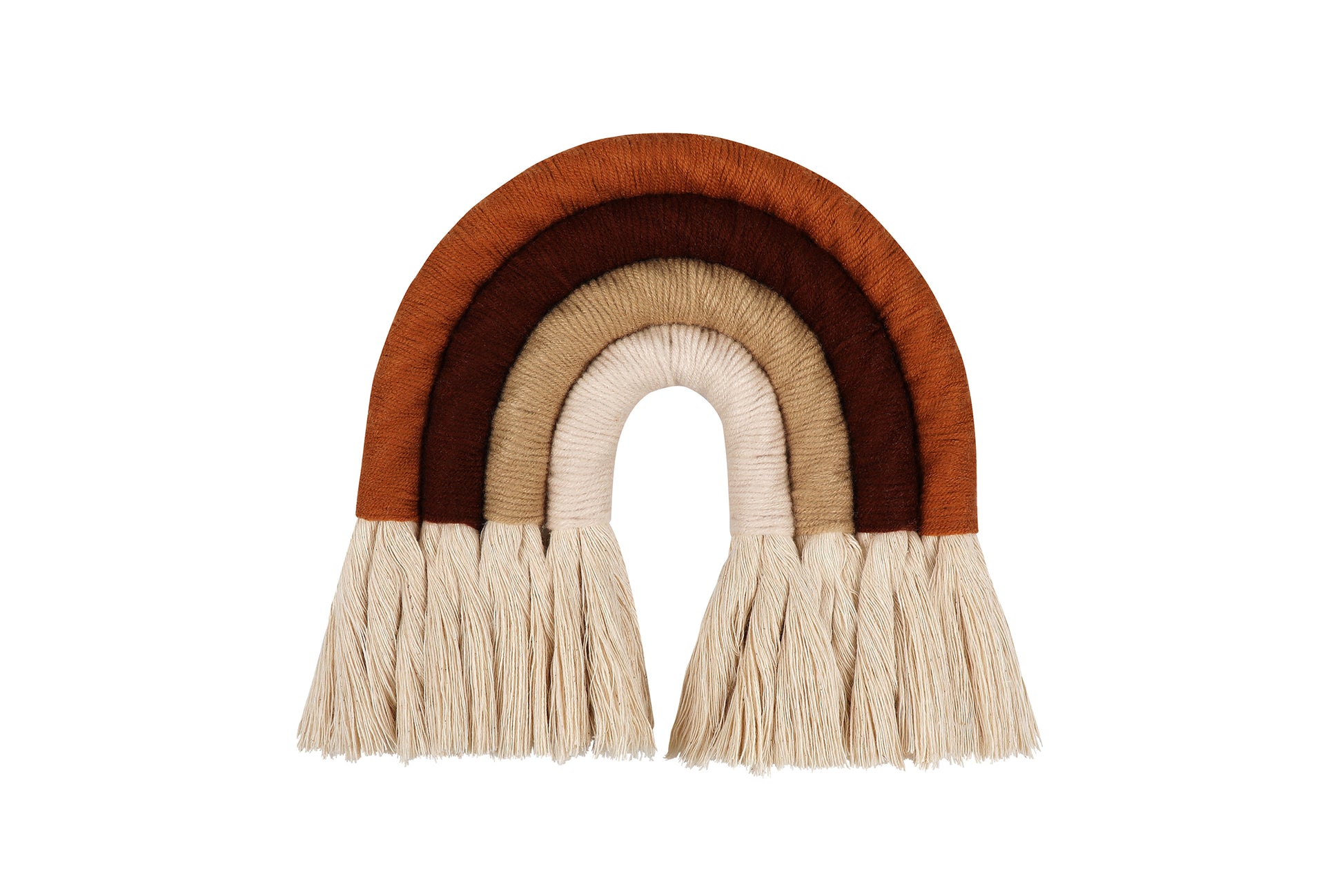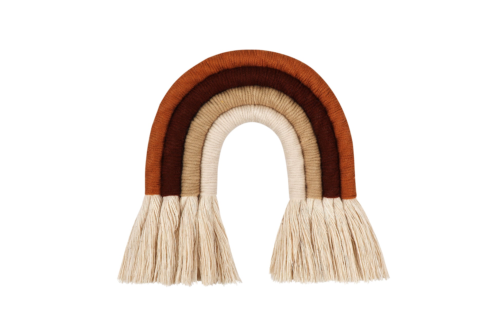 Zeitgenössische Makramee in Form eines Regenbogens. Hergestellt von Hand mit Fasermaterialien. Perfekt als Ergänzung zum Kinderzimmer, zur Babydusche, zum Spielzimmer oder zum Büro.