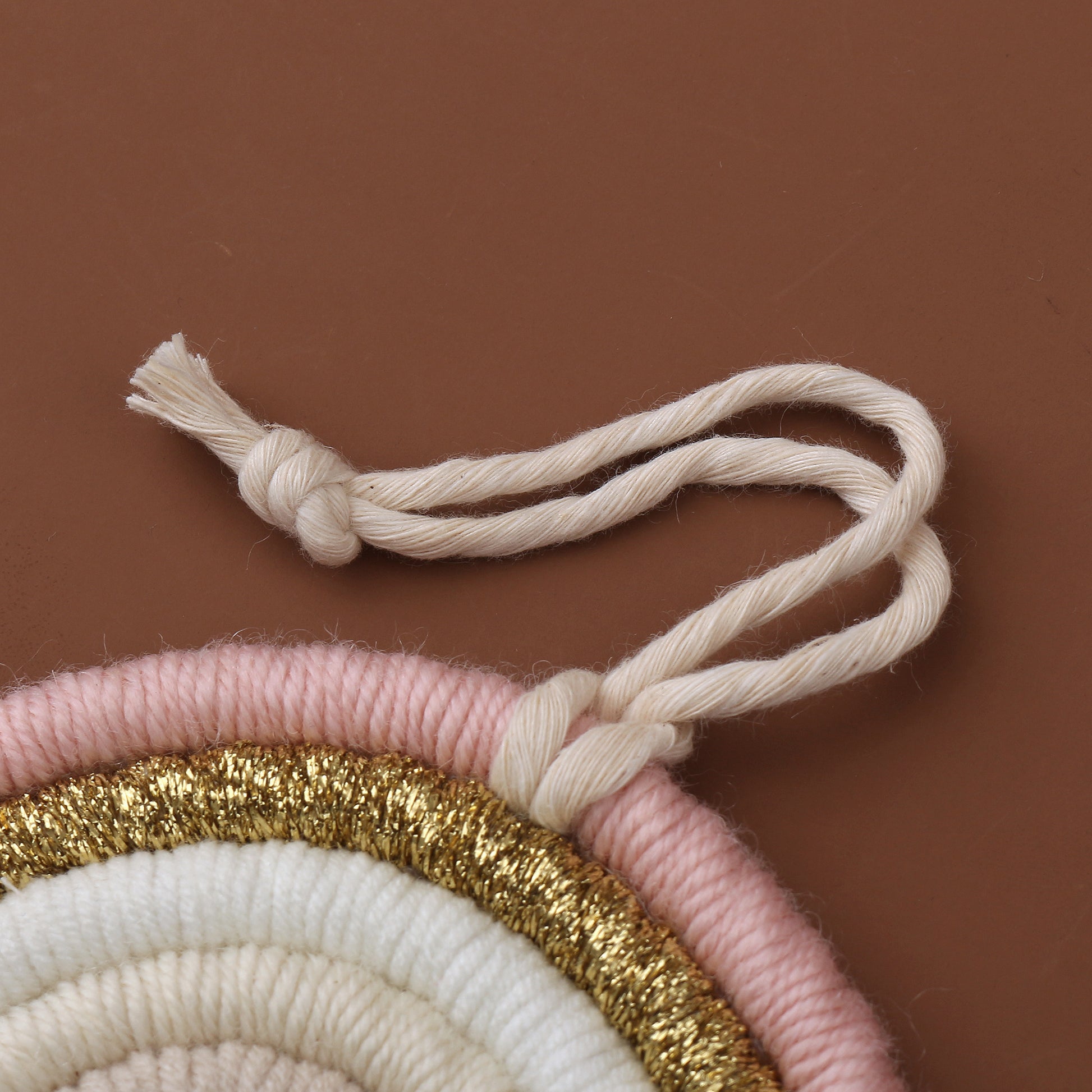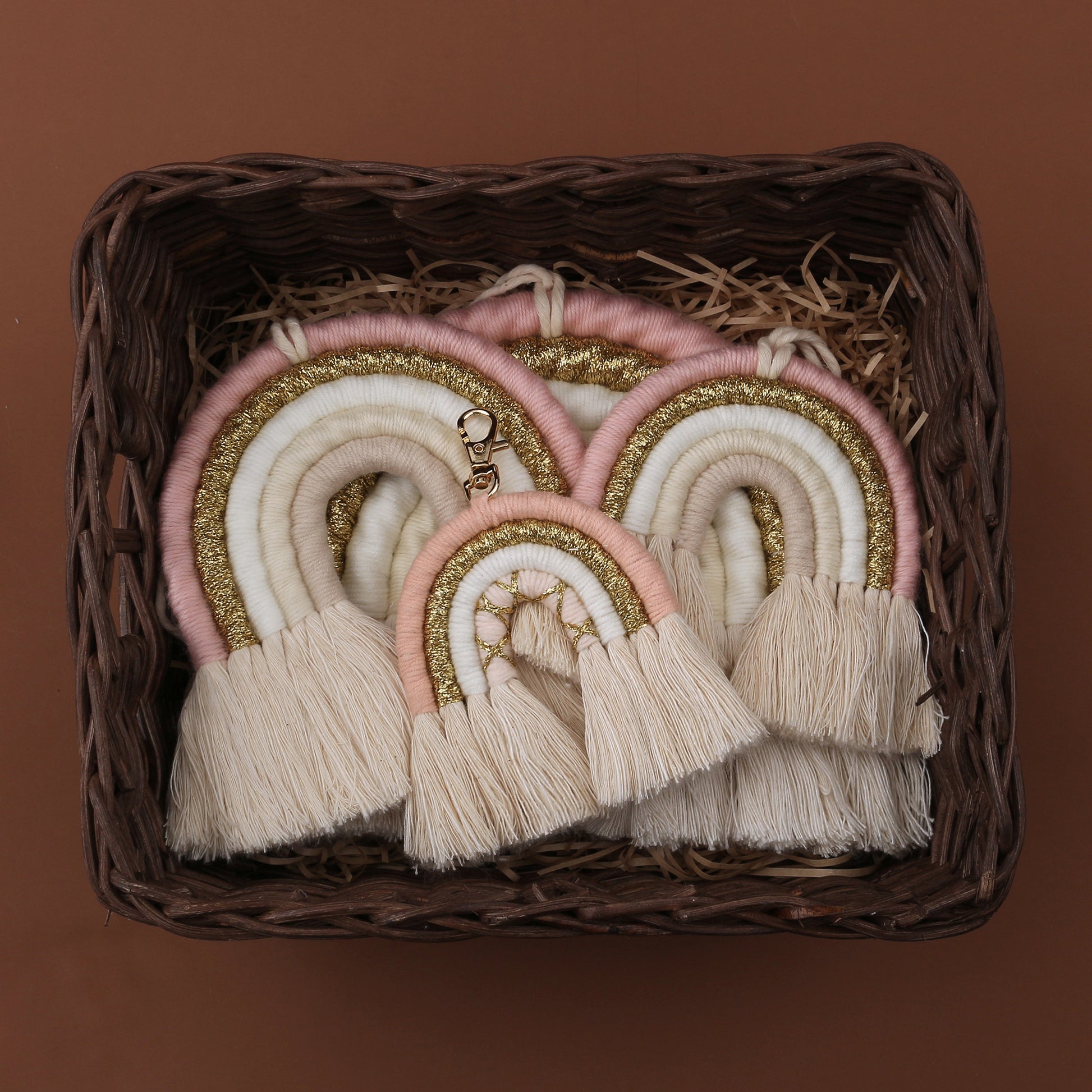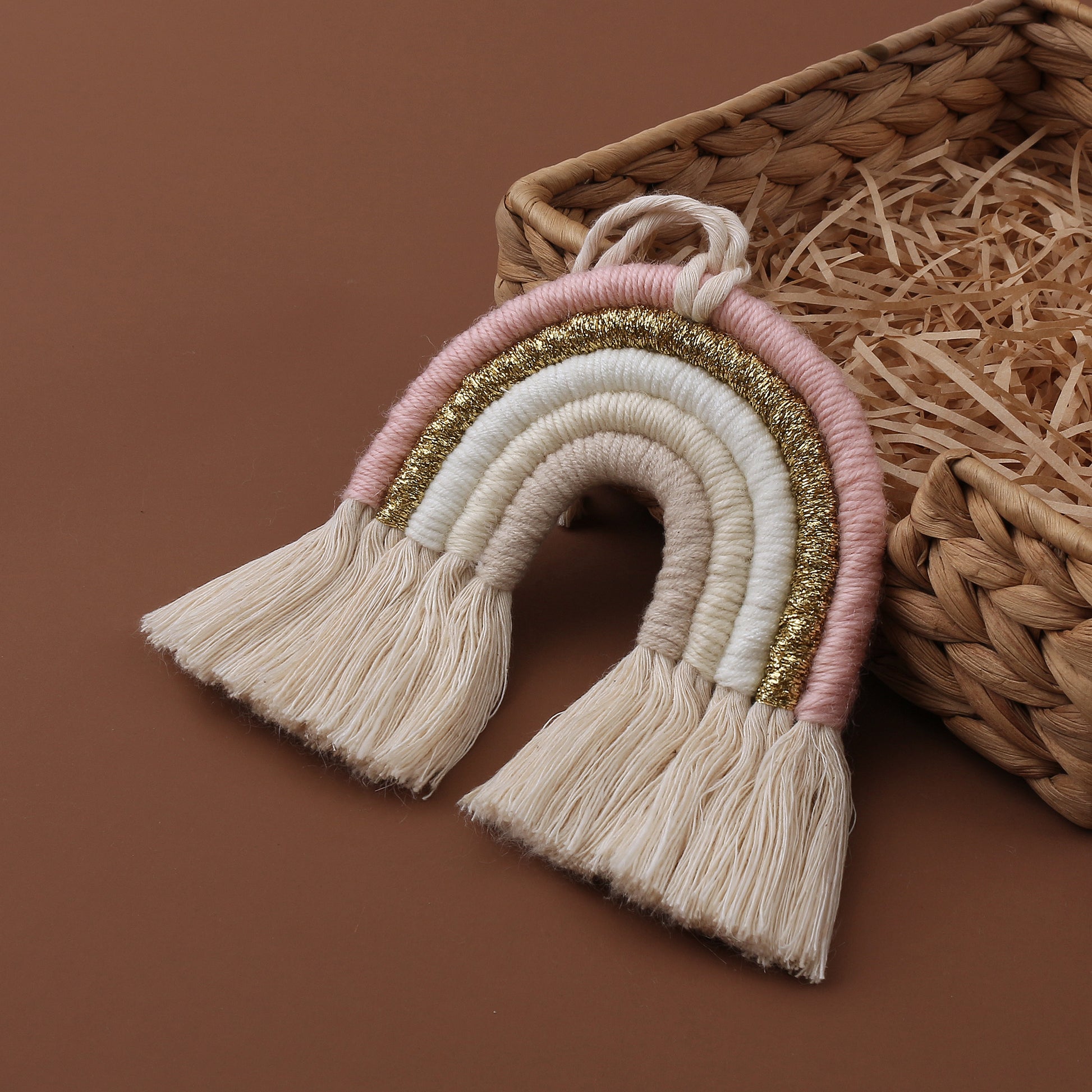 Zeitgenössische Makramee in Form eines Regenbogens. Hergestellt von Hand mit Fasermaterialien. Perfekt als Ergänzung zum Kinderzimmer, zur Babydusche, zum Spielzimmer oder zum Büro.