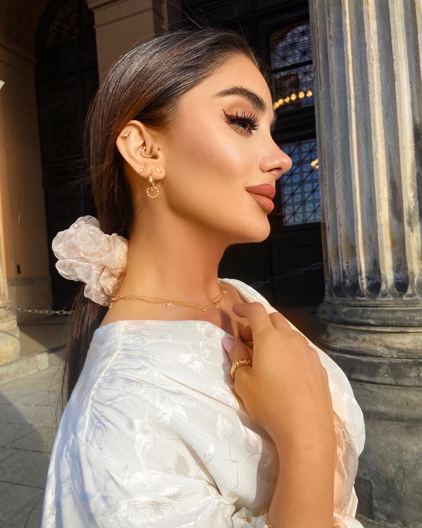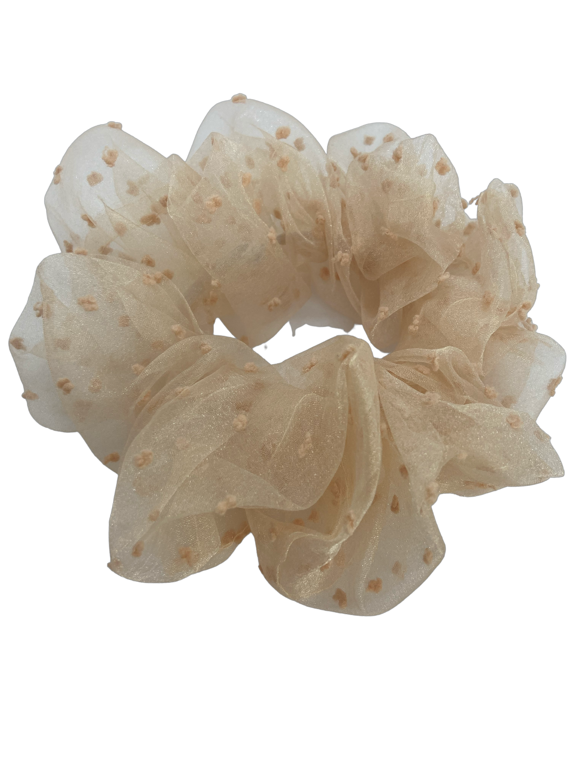 Unser Modell Valerie ist ein oversized Scrunchie mit feinen Punkten, die Deinem Look einen extra Charm bereiten. Nutze den Scrunchie in einem chaotischen Dutt um Dein Alltagsoutfit aufzupeppen. Unser Valerie Scrunchie ist erhältlich in den Farben Himmelblau und Nude.