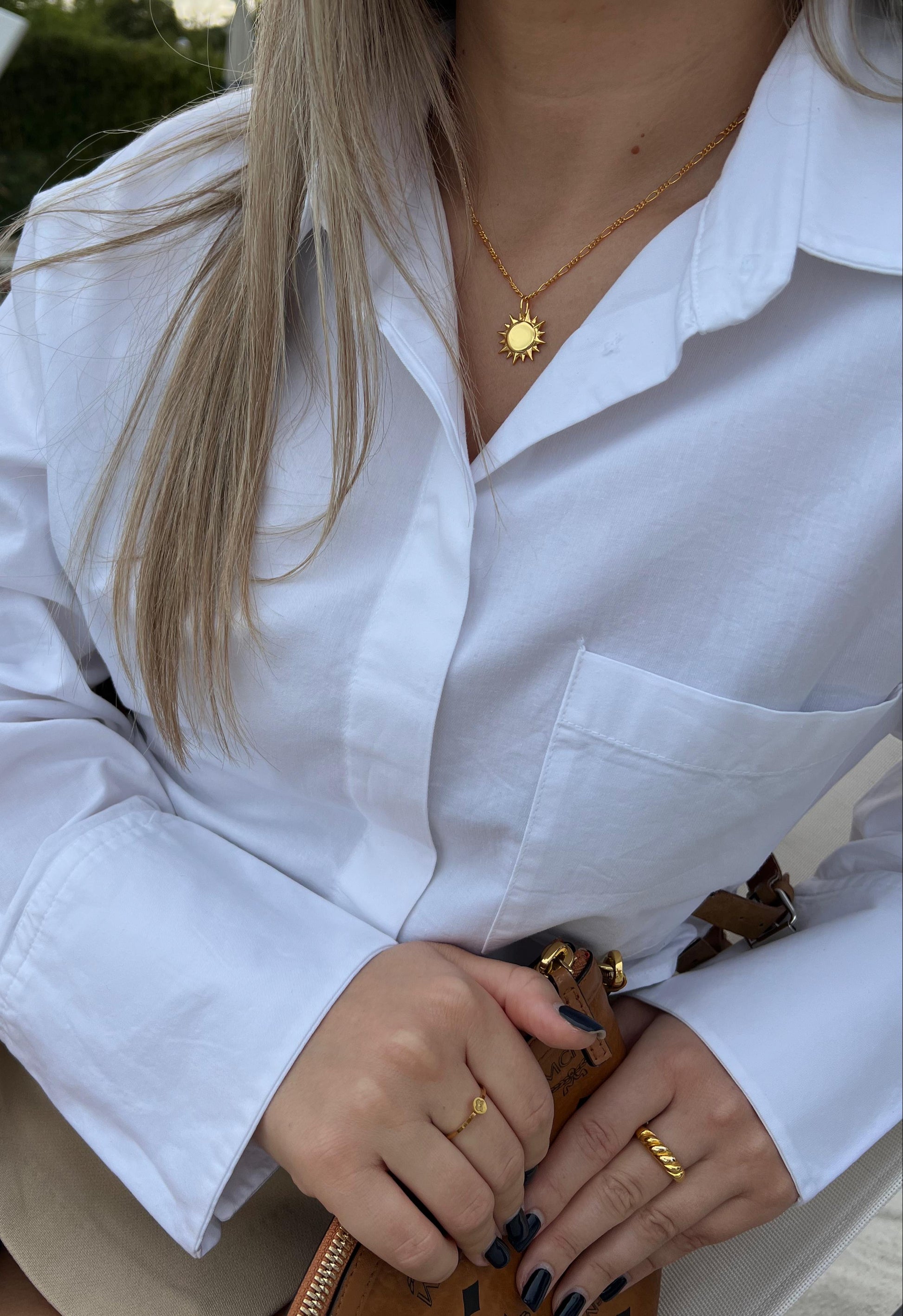 Kombiniere ihn mit unserer Paloma Soleil Halskette und trage die Sonne immer nah an deinem Herzen. Ein elegantes Schmuckstück, das deine Ausstrahlung unterstreicht und jedem Outfit einen Hauch von goldenem Glanz verleiht.